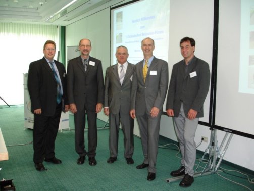 Die Referenten des 1. Ostdeutschen Betonstein-Forums am 3. Mai 2005 in Meerane (v.l.n.r.): Dr.-Ing. Thomas Richter, Dipl.-Ing. Wolfgang Schäfer (beide BetonMarketing Ost), Prof. Dr.-Ing. Lutz Wichter (Brandenburgische Technische Universität), Dipl.-Ing. Rainer Janke (Geschäftsführer der BetonMarketing Ost) und Dipl.-Ing. Clemens Esser (ATELIER ESSER). Foto: BetonMarketing Ost