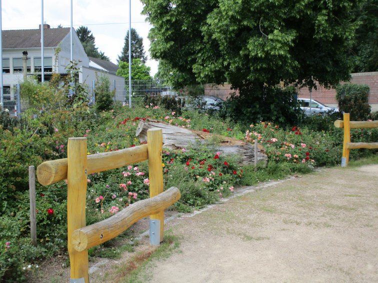Naturnahe Jugendbänke vor der eingewachsenen Rahmenpflanzung des Schulhofs |