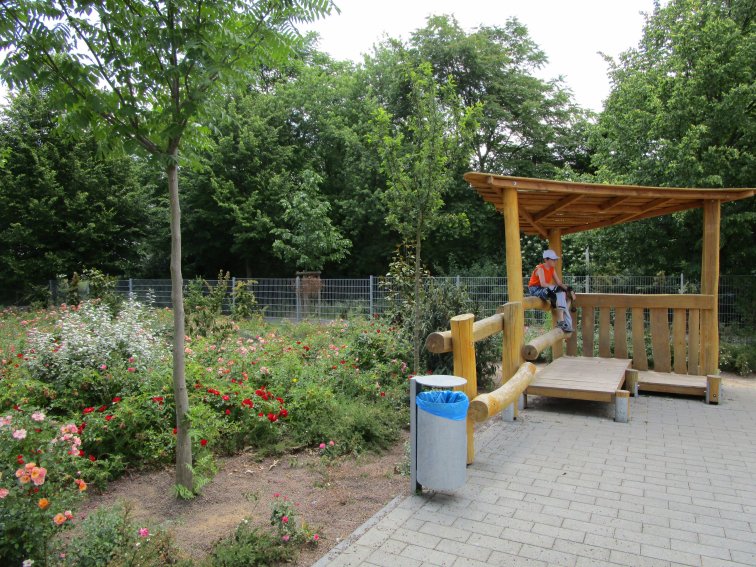 | Überdachter Jugendsitz vor der blütenbetonten Rahmenpflanzung | ||