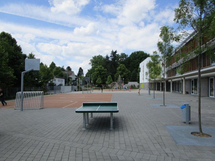 | Typisch für eine AE-Planung sind die hochwertigen Sport- und Bewegungsangebote für die Schulkinder. Ebenso ist die starke Korrespondenz zwischen Gebäude-Fassade und Bodenbelag des Schulhofes typisch für die Arbeiten des AE. Pflasterfarbe und Farbe des Sportbelags sind sehr gelungen auf die Klinkerfarbe und die Farbe der Schattierungselemente abgestimmt. | ||